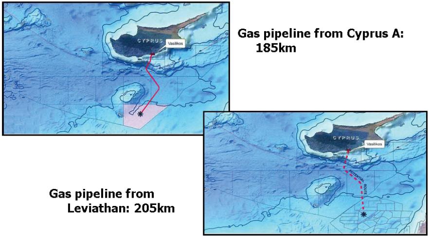 Ασκήσεις επί χάρτου της Κύπρου για τον υποθαλάσσιο αγωγό σε εγκαταστάσεις τερματικού στην περιοχή Βασιλικού. Πάνω: Αγωγός μήκους 185χλμ από το «Αφροδίτη» και κάτω αγωγός μήκους 205χλμ από το «Λεβιάθαν» (Πηγή: Από παρουσίαση Υπηρεσίας Ενέργειας Κυπριακής Δημοκρατίας)