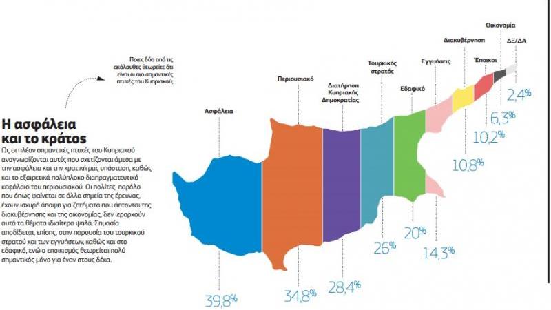 Το καλύτερο εύρημα της Δημοσκόπησης της «Σημερινής» ήταν ότι οι πολίτες θεωρούν ως τις πιο σημαντικές πτυχές του Κυπριακού την Ασφάλεια (με ποσοστό 39,8%) και το Περιουσιακό (34,8%).