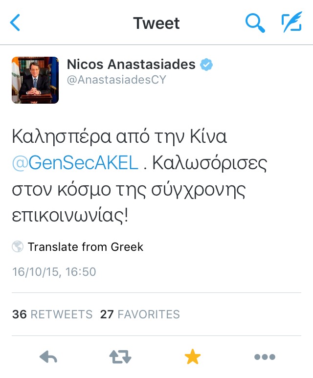 Ο Νίκος Αναστασιάδης, ο οποίος έγραψε προς τον Άντρο Κυπριανού: «Καλησπέρα από την Κίνα @GenSecAKEL Καλωσόρισες στον κόσμο της σύγχρονης επικοινωνίας!»