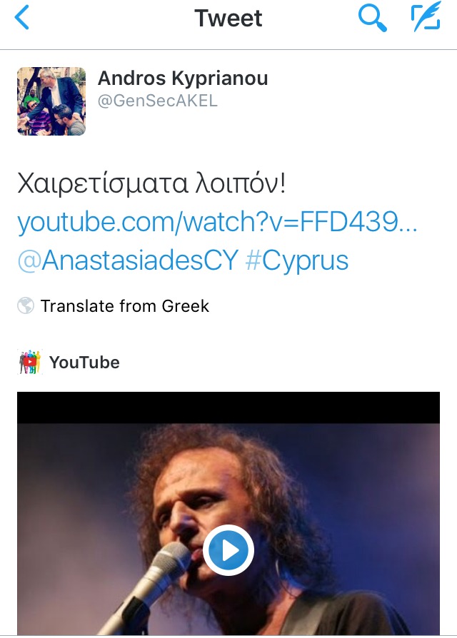 Για να του απαντήσει ο Άντρος Κυπριανού: «Χαιρετίσματα λοιπόν» και να συνοδεύει το tweet του με σύνδεσμο youtube με το τραγούδι του Β. Παπακωνσταντίνου «Χαιρετίσματα».