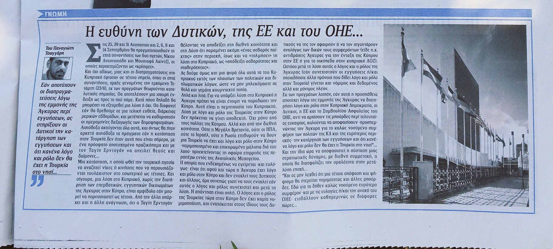 Η απορία που ενδεχομένως να εγείρεται –και ευλόγως- είναι πως αφού και τώρα η Άγκυρα έχει λόγο και ρόλο στην Κύπρο και δεν ενοχλεί τους Δυτικούς και άλλους, άρα συνεπώς γιατί να τους ενοχλεί εάν αυτός ο λόγος και ρόλος συνεχιστεί και μετά την λύση. Η απάντηση είναι απλή. Ο λόγος και ο ρόλος της Τουρκίας τώρα στην Κύπρο δεν έχει καμία νομιμοποίηση, και εναπόκειται στους ίδιους τους Δυτικούς να της τον αφαιρούν ή να τον σιγοντάρουν αναλόγως των δικών τους συμφερόντων (είδε πχ αντιδράσεις Άγκυρα για την ένταξη της Κύπρου στην ΕΕ ή για τα Οικόπεδα στην κυπριακή ΑΟΖ). Ωστόσο μετά τη λύση, αυτός ο λόγος και ο ρόλος της Άγκυρας (εάν συνεχιστούν οι Εγγυήσεις ή/και οποιαδήποτε άλλη πρόνοια που δίδει λόγο και ρόλο στην Τουρκία), γίνεται και νόμιμος και δεδομένος αλλά και μόνιμος πλέον.