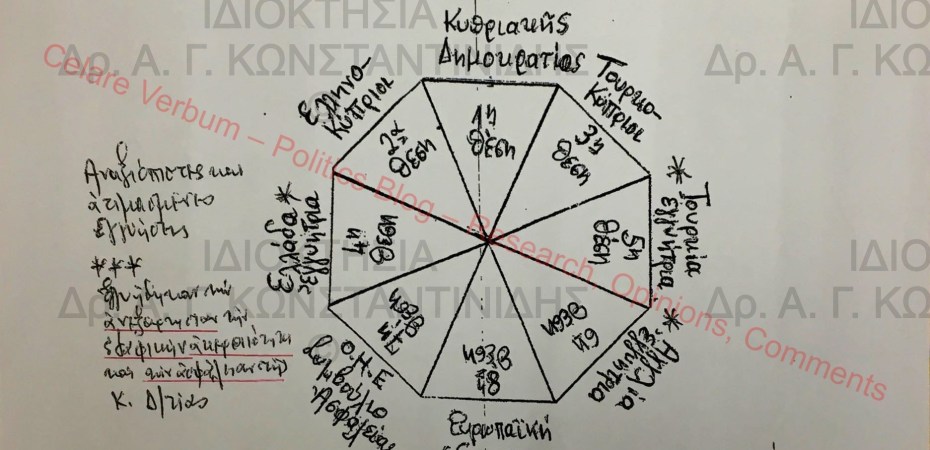 Γιατί το παραθέτω; Διότι ακριβώς, το σχεδιάγραμμα αυτό αποτυπώνει και το πώς λογικά η πραγματικότητα αλλά και το Διεθνές Δίκαιο καθώς και το Σύνταγμα της Κυπριακής Δημοκρατίας ΕΠΙΒΑΛΛΕΙ αυτό το Σχεδιάγραμμα. Ο Δρ. Α. Κωνσταντινίδης το ονόμασε «Διαπραγματεύσεις δια την Λύση στο Κυπριακό. Το οκτάγωνο τραπέζι και η θέση κάθε πλευράς».